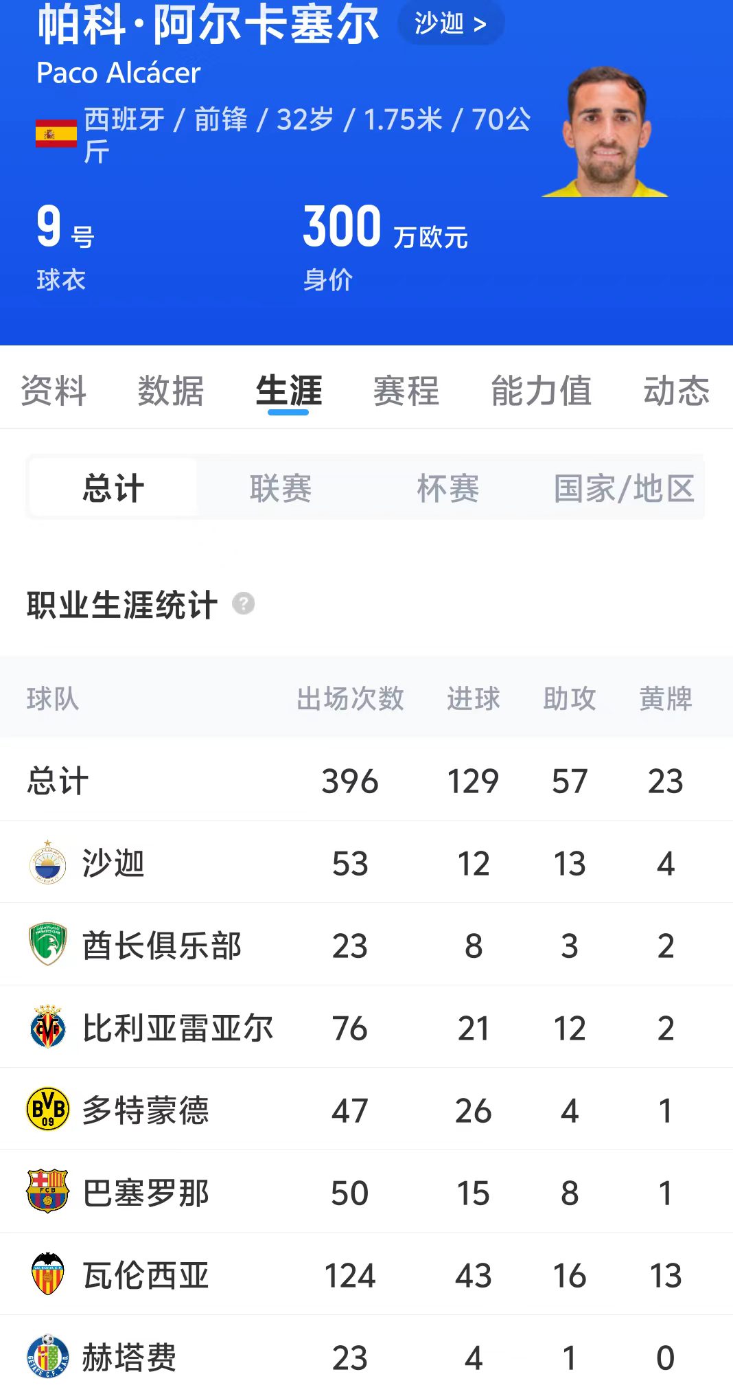 帕科职业生涯共出场396场比赛,打进129球,贡献57次助攻。